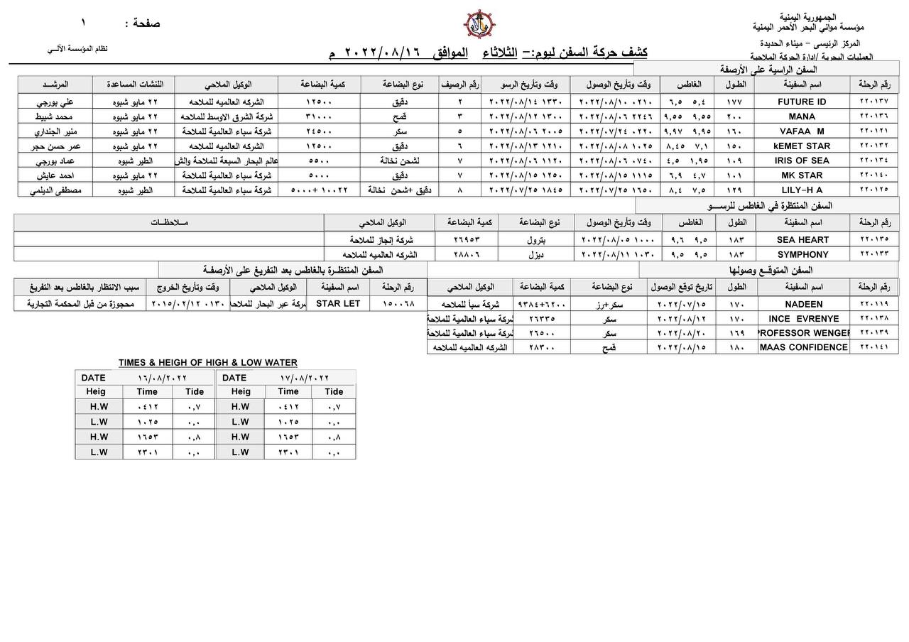 YNP: كشف حركة السفن بميناء الحديدة_ الثلاثاء - 16/08/2022