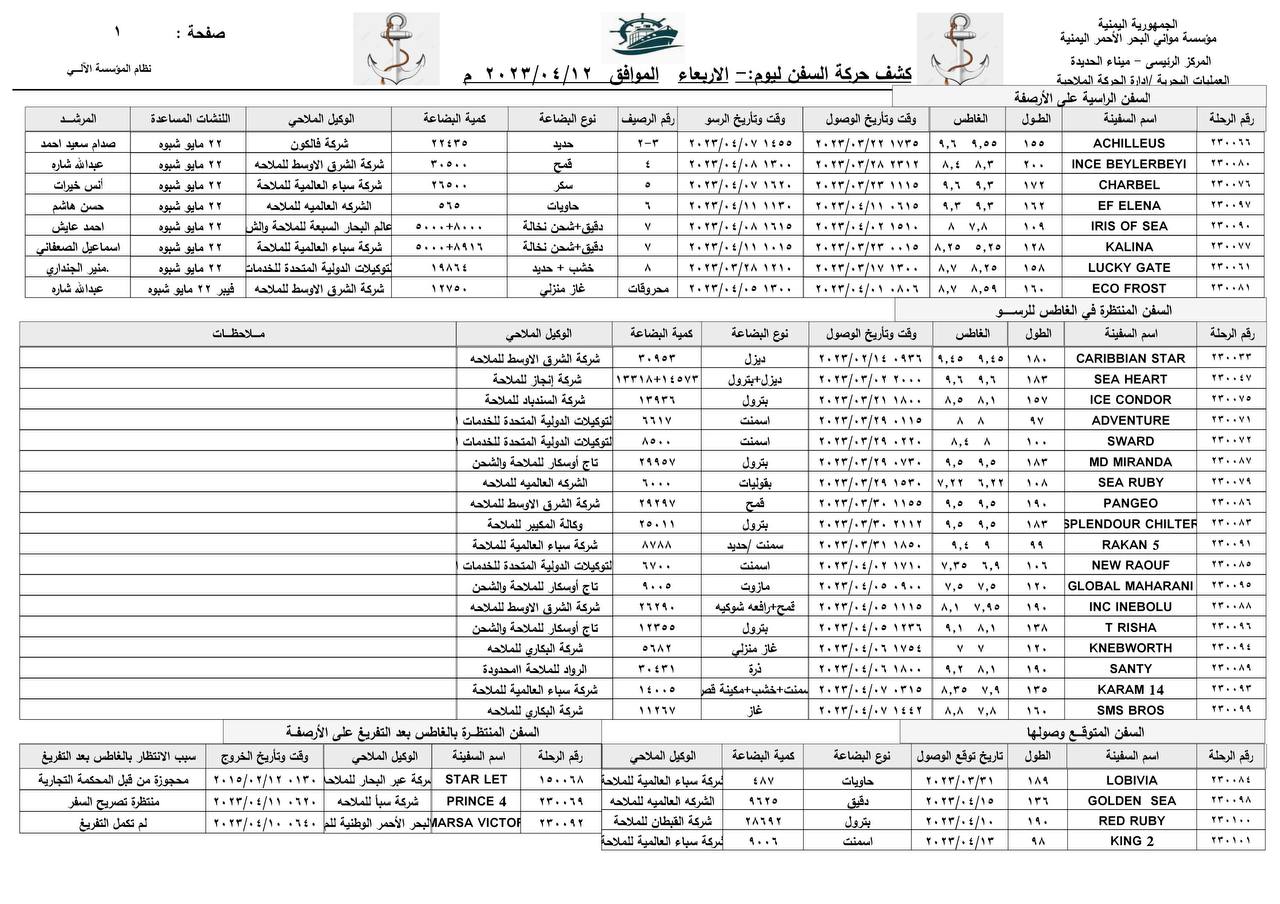 كشف حركة السفن بميناء الحديدة-الأربعاء - 12/04/2023