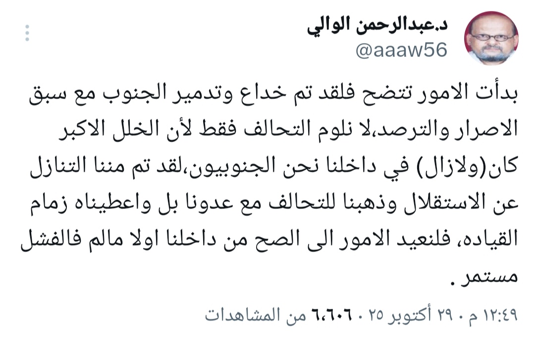 وقال الاكاديمي عبدالرحمن الوالي في تدوينة على (إكس): " بدأت الامور تتضح فلقد تم خداع وتدمير الجنوب مع سبق الاصرار والترصد".
