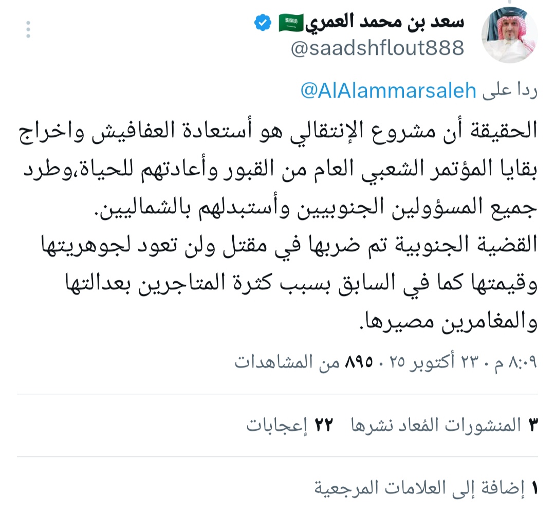 وقال الناشط السعودي سعد العمري في تدوينة على (إكس): " الحقيقة أن مشروع الإنتقالي هو استعادة العفافيش واخراج بقايا المؤتمر الشعبي العام من القبور وإعادتهم للحياة، وطرد جميع المسؤولين الجنوبيين واستبدالهم بالشماليين ".