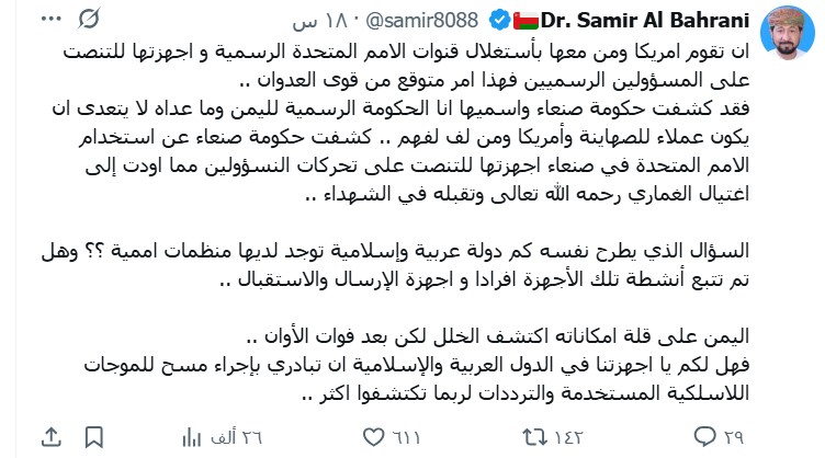 وانتقد البحريني استخدام أمريكا لقنوات الأمم المتحدة الرسمية وأجهزتها الرسمية للتجسس، مؤكدًا كشف اليمن قيام الموظفين الأمميين بوضع أجهزة تنصت على المسؤولين اليمنيين، على رأسهم رئيس الأركان، اللواء الركن محمد الغماري، والذي استُشهد بعدوان إسرائيلي على صنعاء.