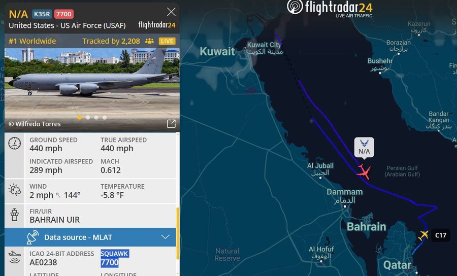 واظهرت المواقع هبوط اضطراري لطائرة التزود بالوقود الامريكية في قطر عقب اطلاقها نداء استغاثة بتفعيل الكود "7700".