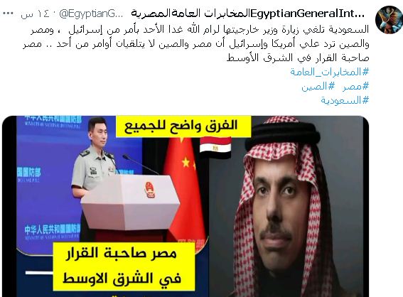 وكانت الحسابات المصرية تعلق على اعلان السعودية الغاء زيارة وفد عربي يقوده وزير الخارجية فيصل بن فرحان إلى رام الله بعد منع إسرائيل.