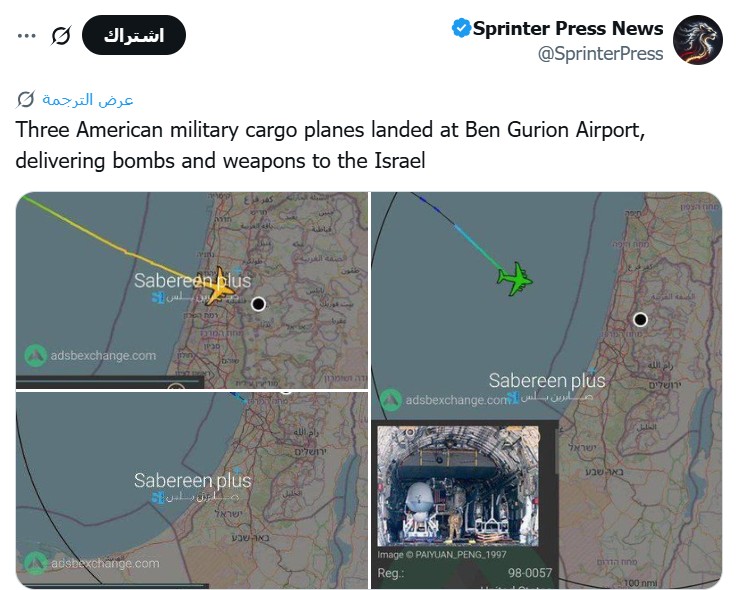 وأظهرت مواقع التتبُّع الملاحي وصول عدة طائرات شحن عسكري أمريكية إلى مطار بن غوريون.